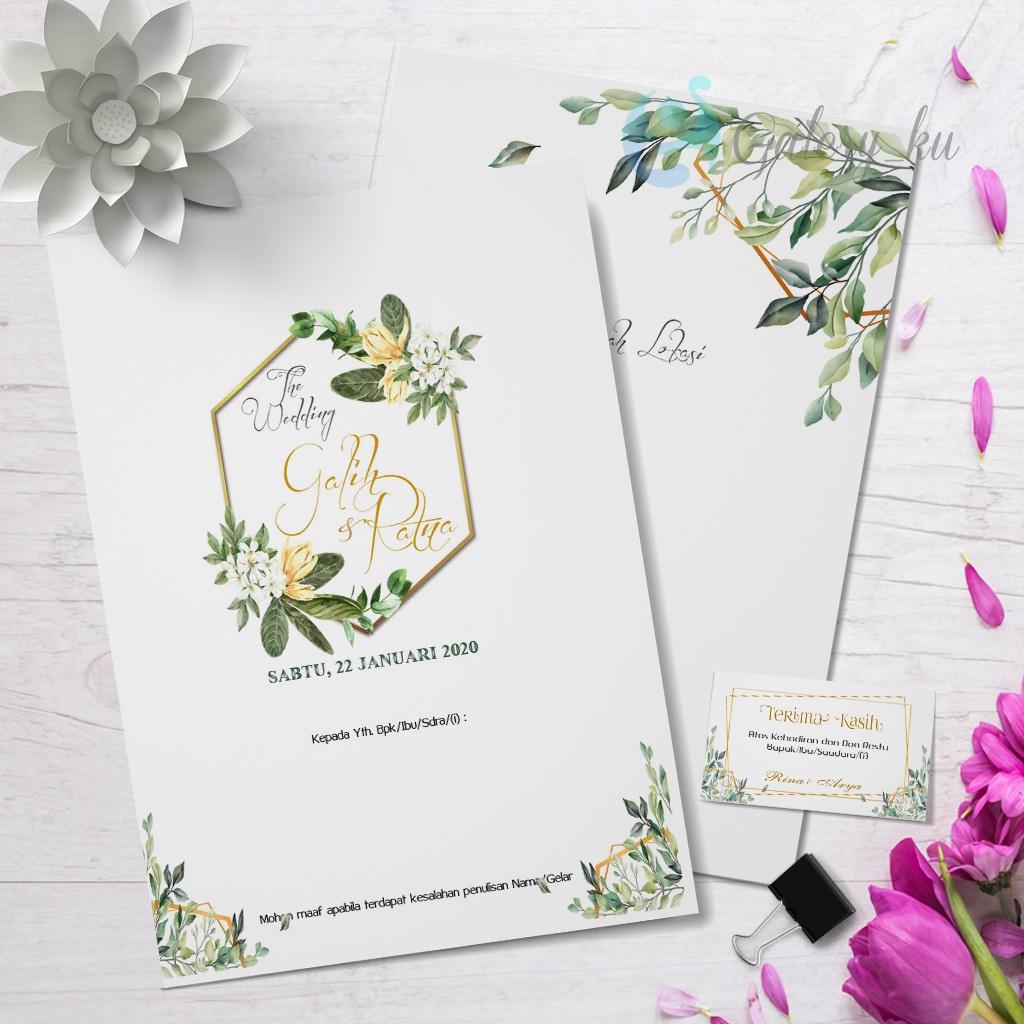 Undangan pernikahan bunga dengan sentuhan keemasan ini cocok untuk kamu yang akan menggelar resepsi pernikahan dengan warna nude, kecokelatan atau nuansa alam.